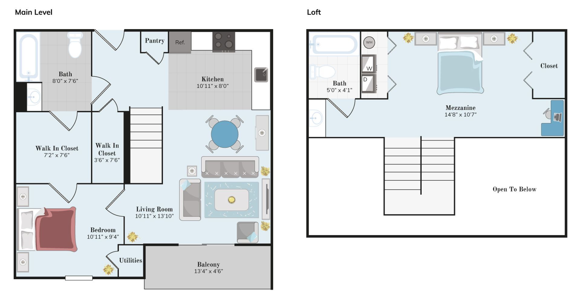 This home's loft-style floor plan offers soaring ceilings and a layout perfect for entertaining. The kitchen features quartz countertops and stainless steel appliances.