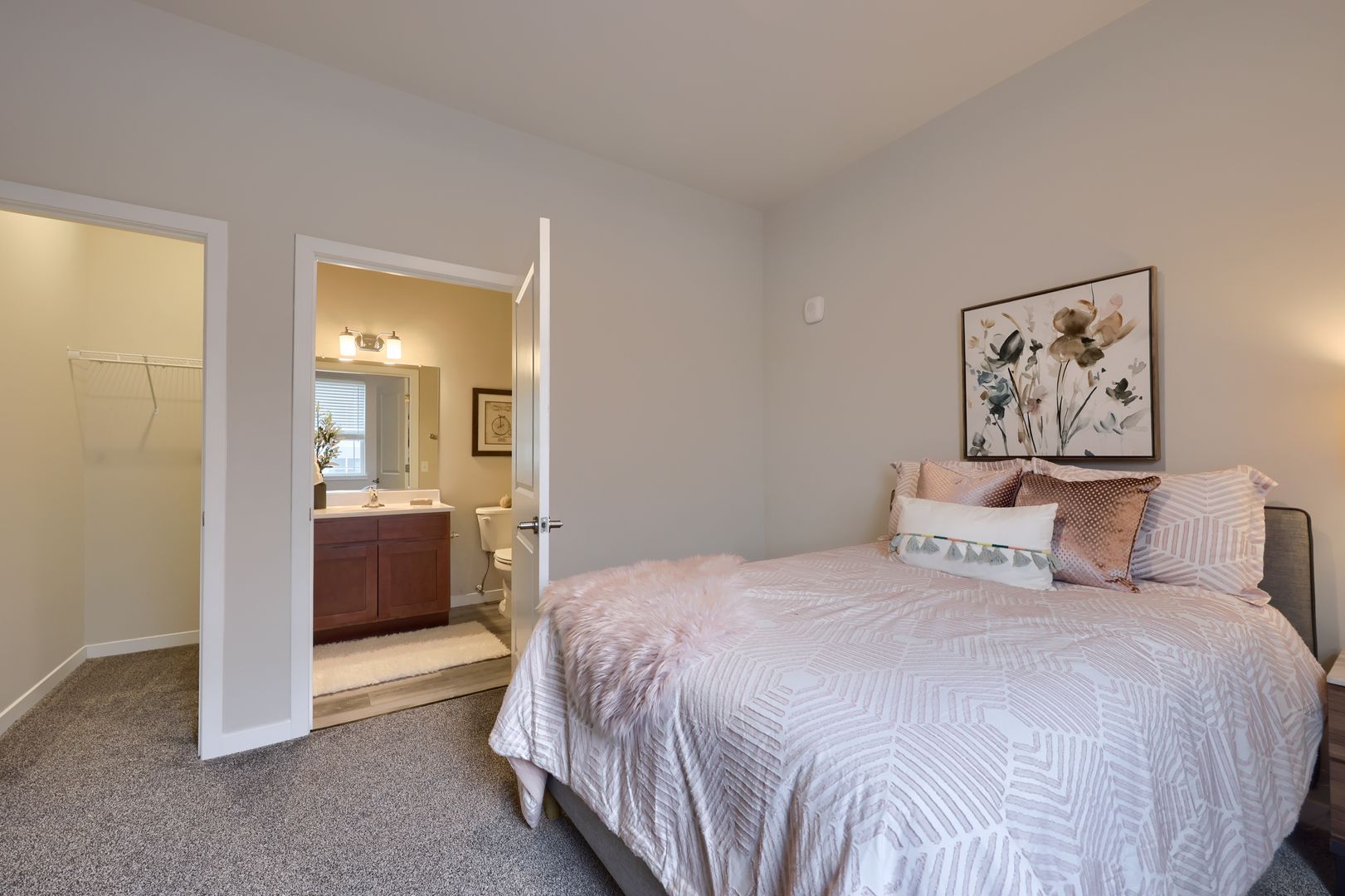 This home's flat-style floor plan features an expansive island kitchen, private balcony and two suite-style bedrooms, each with direct bathroom access.